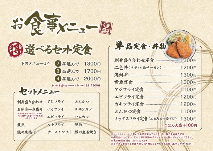 ※写真は刺身盛り合わせ+煮魚+エビフライ